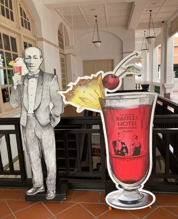 No trip to Singapore would be complete without sampling its most famous libation, the Singapore Sling, served at its birthplace, the original Raffles Hotel. Not being strict teetotalers, we hired a cab, and made a beeline for this site of bartending history. We were not disappointed in the appearance of this hostelry, originally built in the 1830s, and named Emerson’s Hotel. Due to deaths, and finances, it changed hands numerous times. When finally the Sarkies Brothers leased the property, and built it up into a high-end hotel. It opened as such in1887, and was named for Singapore’s founder, Sir Stamford Raffles. It is now owned by Katara Hospitality, and operated by Accor Hotels, of which we are members. Yes. We are genuine members of the Accor Club. Showing our membership card to the liveried greeters, and our waiter entitled us to a table for two and a round of Singapore Slings at the regular price, along with a bag of peanuts that we were shown to shell and toss the shells on the floor. How’s that for, as Ralph Kramden would say, “Being big shots?” Seriously, it was a study in correct service, and drinks. Once again, “RAFFLES RULES.”