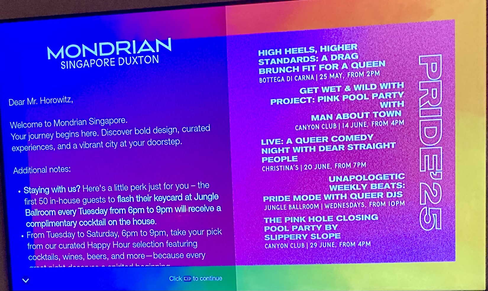 To some, this may have seemed a bit avant-garde. To others, it may have seemed a bit of foreshadowing. As you will see, it was a bit of both. Being judgmental has no place in this glowing international metropolis. Indian, Chinese, Japanese, European, and American food stands, and restaurants, as well as houses of worship, stand side by side in total repose. It seems to welcome all travelers, young or old, hip or square. All that the Singaporeans seem to want to retain is the status quo of cleanliness, and organization. Thus, as you see the decoration that greeted us in the lobby, you might understand once you read the “activities” poster below. Yes. The Mondrian is a “Gay Hotel.”