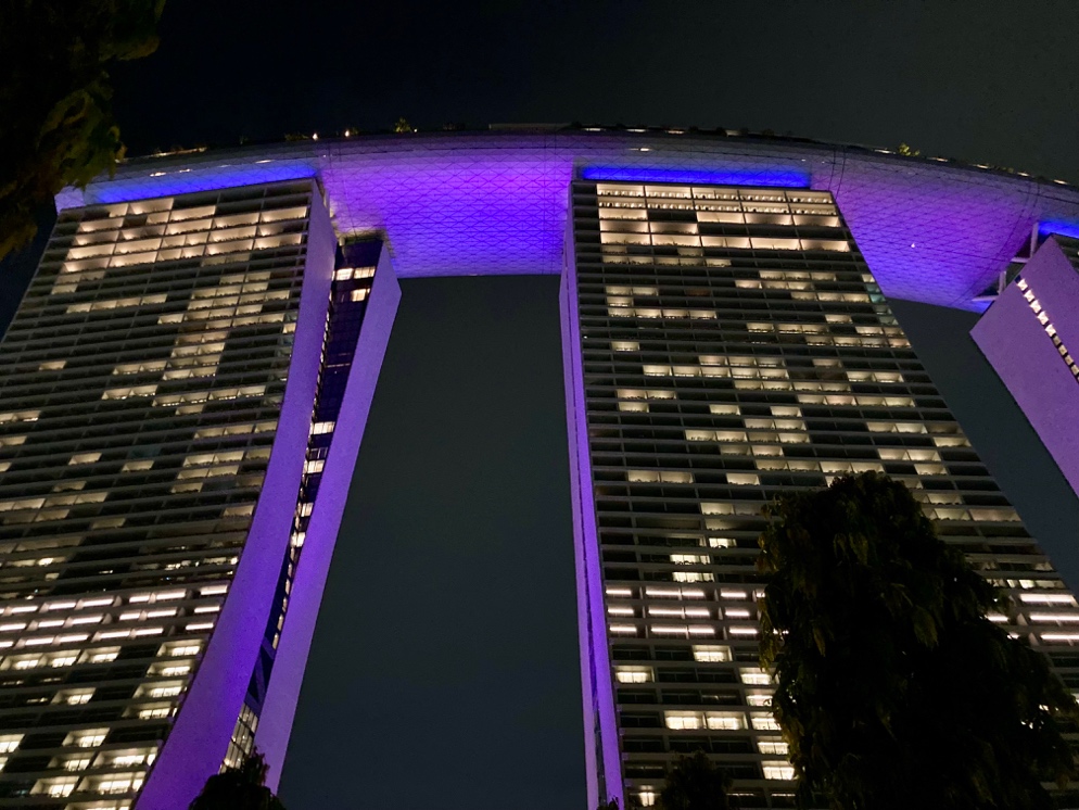 This is a night view of the Marina Bay Sands Hotel. They change the colors intermittently from purple to pink and blue.