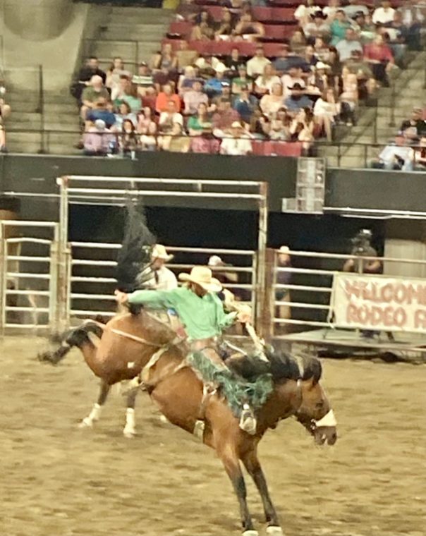 After a few hours of carousing around the fairgrounds, and sampling some goodies, as well as seeing the latest creations for the kitchen, the barn, and “natural nostrums” of all sorts for whatever ails you, it was time to go to our seats in the rodeo pavilion. And what seats they were, third row on the “fifty-yard line.” As an aside, one should never go into a rodeo without at least one beer in hand. Thus it was that we blended with the locals, Aloha shirts and all.