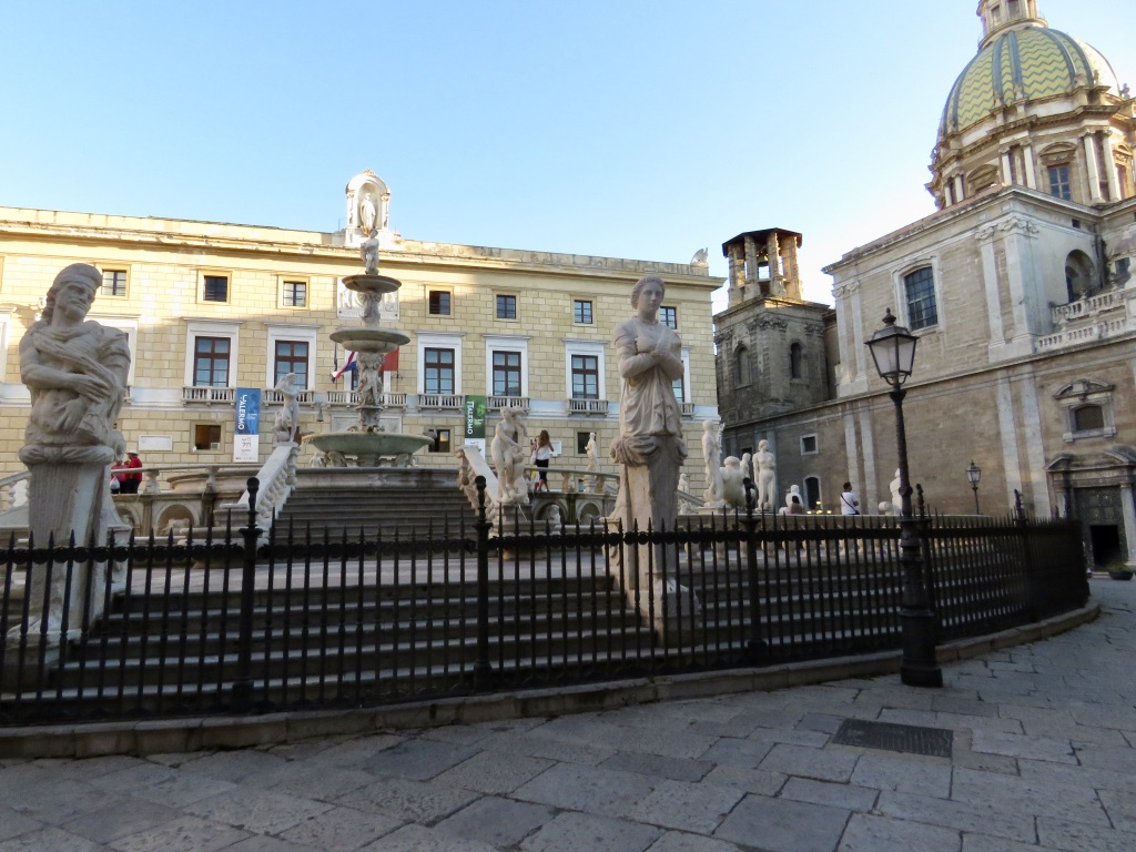 Moving on, we found the Jewish ghetto, Piazza Meschita. It’s in pretty sad shape. After a few depressing minutes, we took off to see other more well-kept sights. When we encountered the Piazza de Pretoria it looked like something out of a movie set for a sculpture advertisement. Everything was so finely done and placed, that it didn’t seem cluttered. It bore a striking resemblance to some piazzas in Florence and Rome. Who said “Sicily isn’t Italian?”
