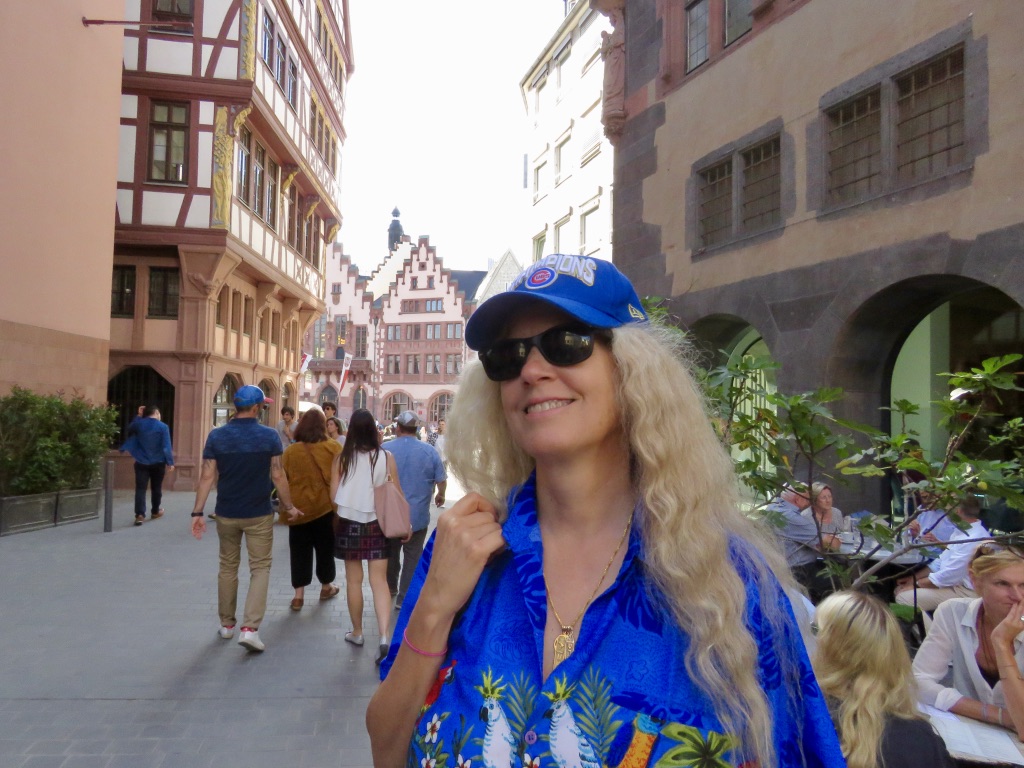 The day following the party, Peter and his fiancé, now wife, Astrid took us around the area known as the “New Old Town Frankfurt.” What has happened is that the old part of Frankfurt has been given a “facelift” restoring it to the way it was 400, or more years ago, bright, garish colors and all. It’s quite something to see. So often we who live outside of Europe are lead to believe that the buildings of ancient cultures were just stark white. This is partly because with the passage of time, the colors bleached out, and/or white paint was cheaper to cover the wood and plaster. However, when we were in Greece, Italy/Sicily, Egypt, China, and Africa, we saw that this was not the case. The ancients reveled in their bright colors much the same as we in the 1960s went color-crazy. This is Naomi in the midst of some buildings from the 16th Century that have been restored and painted as they were then. Peter Max would have been “The Man” in that era.