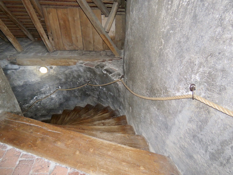 Here is the center of town, with the castle and tower looming over it. Yes. All of the streets are narrow, as are the stairways in the castle, leading to the top of the tower. Enough climbing, and bumping walls, made it obvious that this was not constructed for Walmart shoppers. The castle houses lots of weapons and art from the 16th Century, along with the furniture and fashions of the time.
