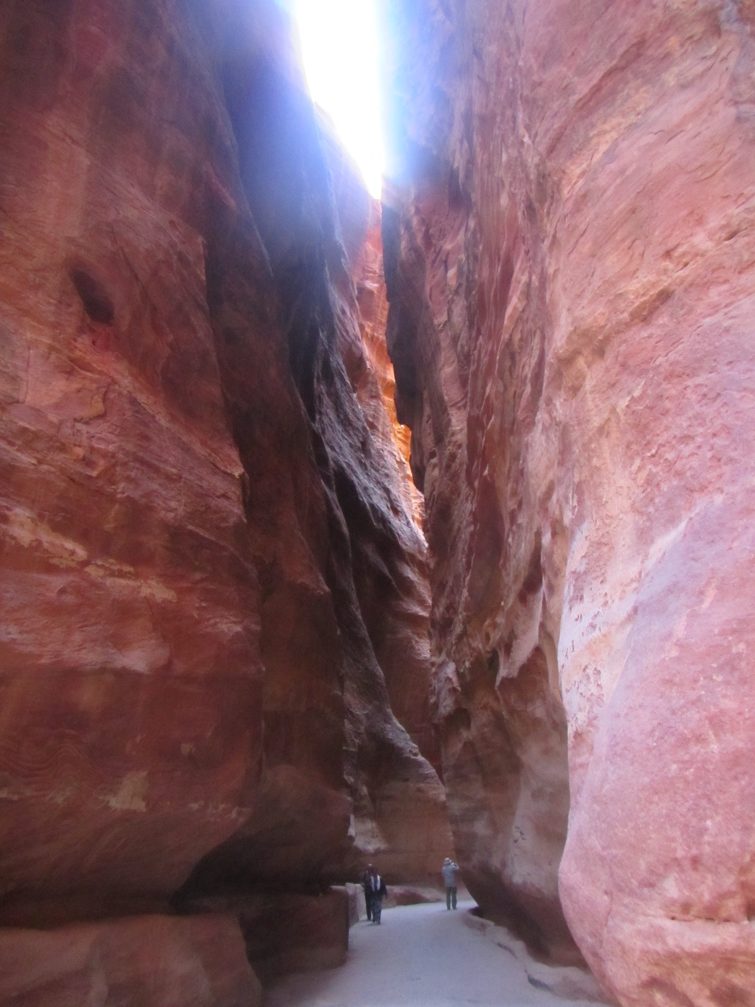 It’s not known exactly when Petra was built, but the city began to prosper as the capital of the Nabataean, pronounced “NABA TEE ANN,” Empire from the 1st Century BCE, where they grew rice, which they traded for frankincense, myrrh, and spices. It was later taken over by the Roman Empire, and continued to thrive until a large earthquake in 363 CE destroyed most of it. Not being Californians, the natives abandoned it. Petra is also known as the “Rose-Red City” because of the color of the rock from which many of the city’s structures were carved. The Nabataeans buried their dead in complex tombs that were carved out of the mountain sides. The city also had temples, a theatre, and later on, a colonnaded street and churches. The gorges are known as Siqs, pronounced “Seeks,” which lead into Petra.