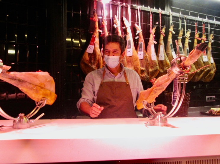 We knew that things were looking up when our taxi driver found our hotel without getting lost like the last time we were here. This is a remedial trip. The last time that we were here, my appendix ruptured and I spent eleven days in a hospital room following emergency surgery. No longer having to worry about my appendix, we made it to our hotel, unpacked and had a cocktail. Thank goodness Naomi remembered our room number from our previous visit, so we got the same one with a wonderful view of the neighborhood. The location was also ideal for shopping, as well as transportation. We were just a block from the Metro. Our favorite market was within 100 meters of our hotel. Here are some Madrid Mushrooms that we found. Yes. They really are that big. We also stopped at our favorite charcuterie. Yes. Fresh cut prosciutto.